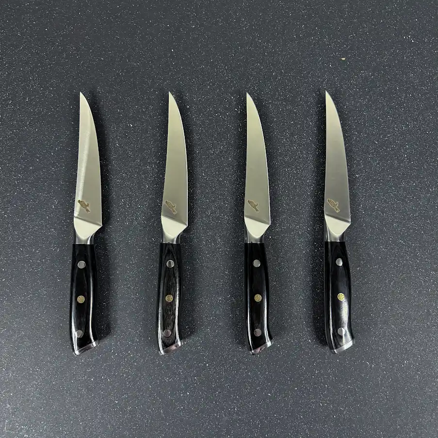 El cuchillo de Mesa “Lautaro” es la pieza perfecta para disfrutar cortes de carne con elegancia y precisión. Diseñado para chefs, parrilleros y amantes de la buena mesa, destaca en la cocina y en la mesa por su estilo y desempeño impecable. Forjados en acero alemán 1.4116, ofrecen un filo consistente y resistente al desgaste. Su hoja de 11 cm y 2 mm de espesor permite cortes suaves y limpios, realzando la experiencia de cada bocado. La empuñadura de madera Pakka aporta distinción y ergonomía, garantizando comodidad al manipularlo.